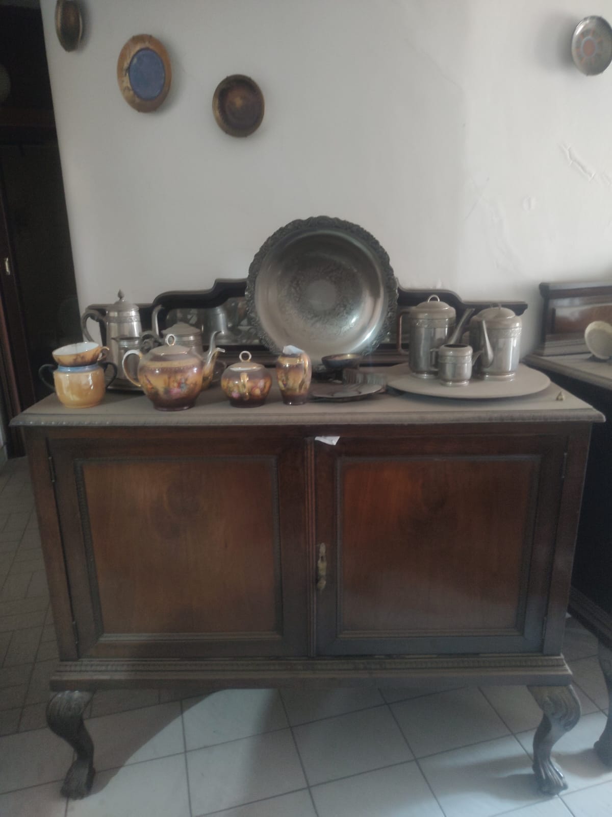 Aparador antiguo cuatro patas de aproximadamente 80 cm. X 40 cm x 90 cm de alto. Posee en juego de té en seis piezas, más un plato del mismo material de 30 x 30 cm.