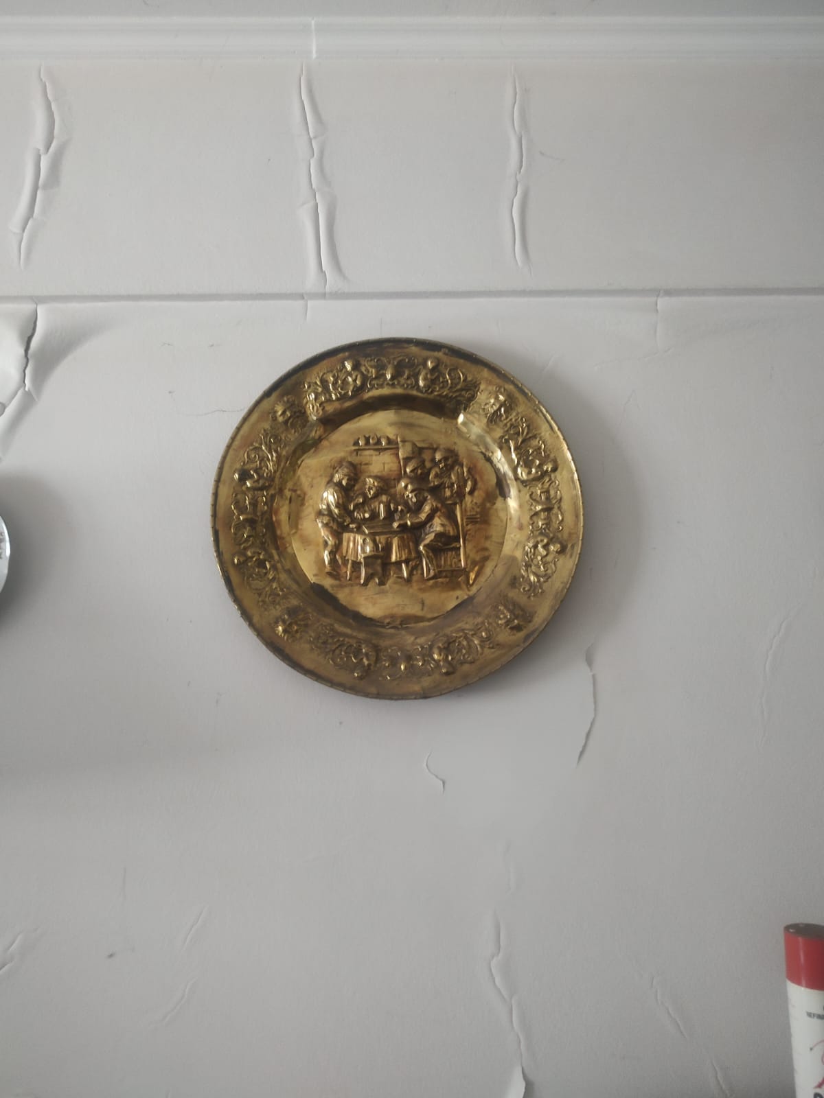 Lote 12: Candelabro de bronce para dos velas. * Cenicero de piedra estilo ónix * Dos platos de cobre de 40 x 40 cm. * 2 candelabros de hierro * Cadenas de cobre * Cuadro enchapado * Porta cenicero de madera *Candelabro de madera. Precio de reserva $10.000;