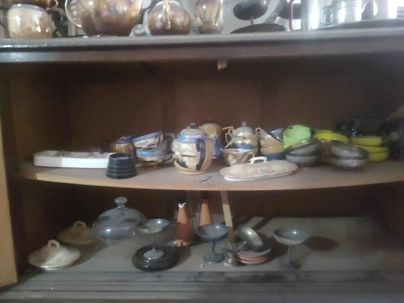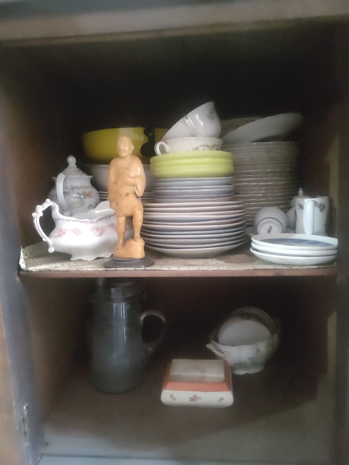 Lote 14: Juego de té de cerámica verde y blanca x 4 piezas * Mantelería y servilletas en mal estado.*Juegos de platos, platos chicos, fuentes, teteras de porcelana. * Juego de ensaladeras, fuente y tasas de té de porcelana.* Alacena de 40 cm x 80 cm. * trajes envueltos en bolsas de plástico. Precio de reserva$10.000;