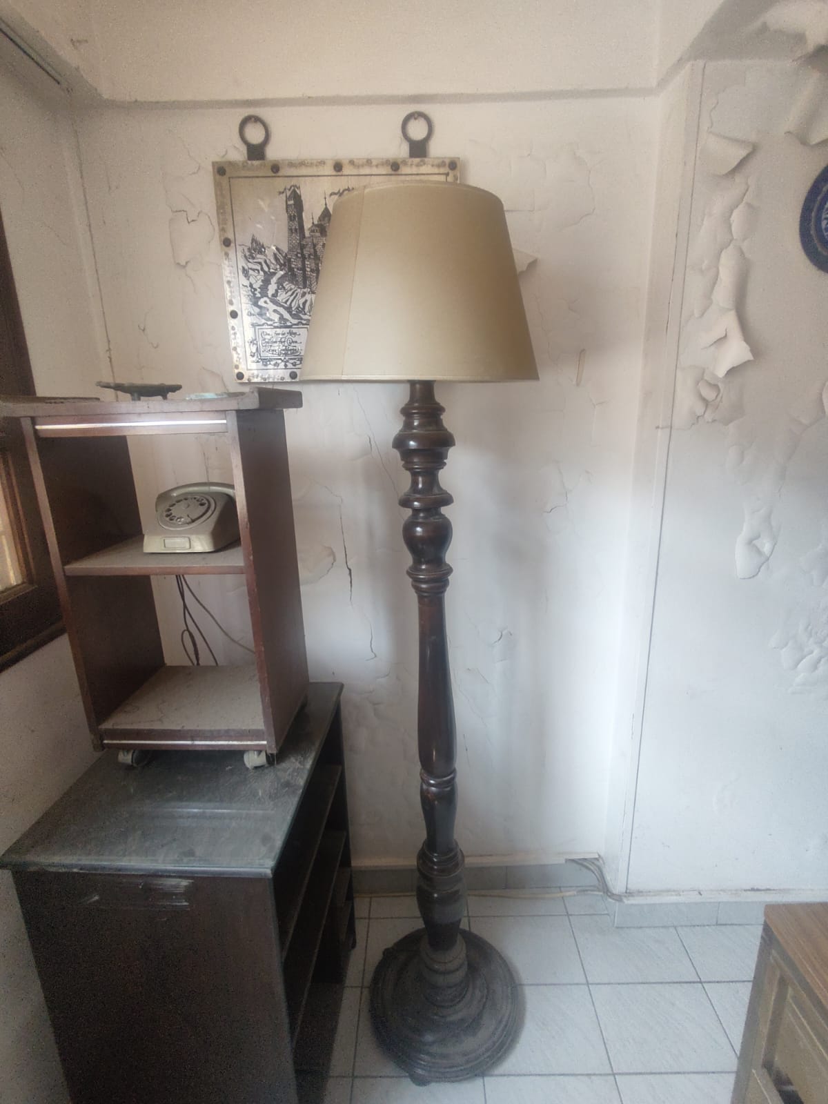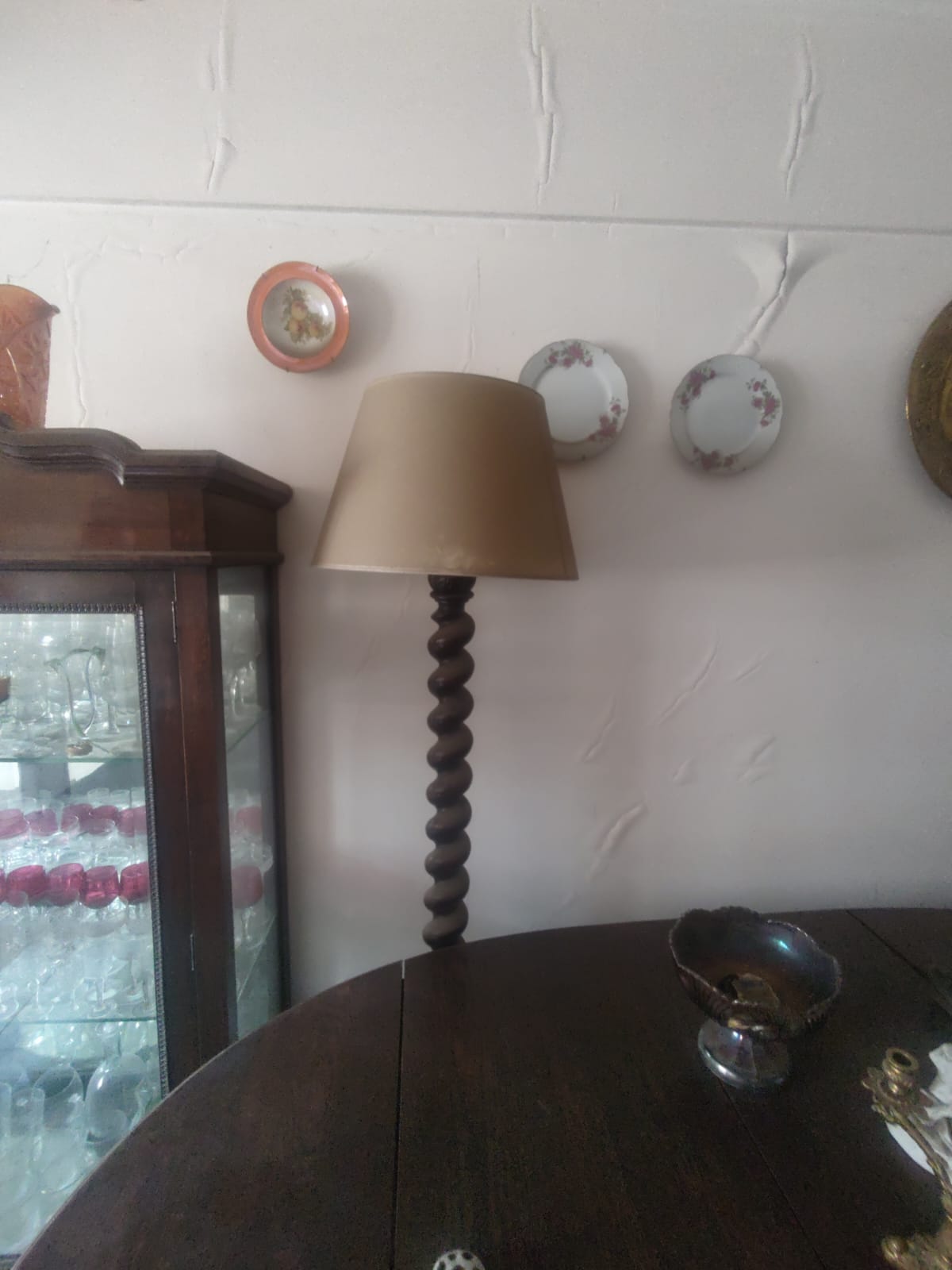 * Una lampara de madera alta de 1.60 mts., aproximadamente, base de bronce y pantalla.