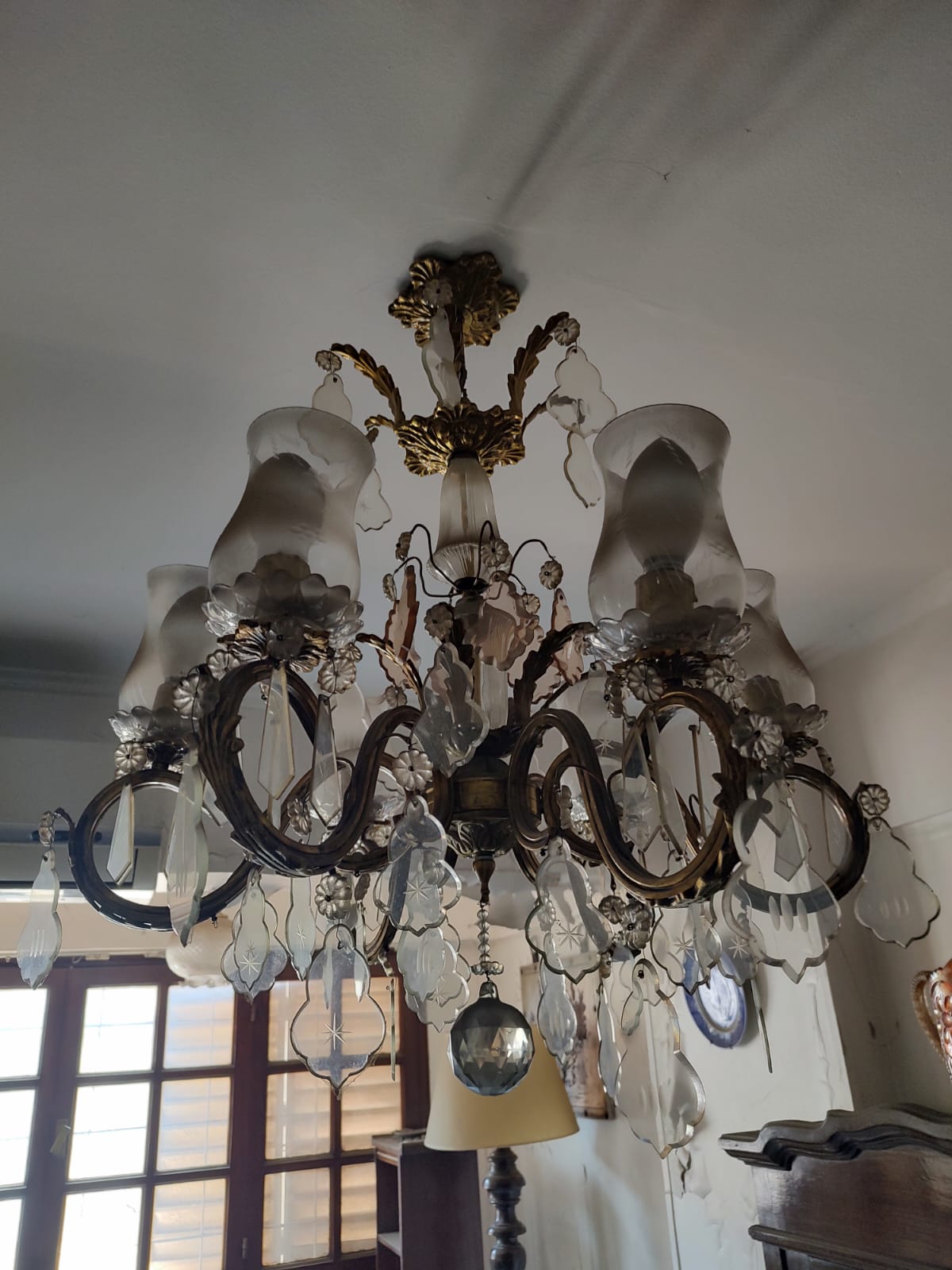 Lote 16: 2 lamparas de cobre con vidrio * Lampara de pie de madera tallada con pantalla * Luminaria de vidrio y cobre. * Luminaria de vidrio y bronce *2 lamparas de madera tallada.* Una lampara de madera alta de 1.60mts., aproximadamente, base de bronce y pantalla. Precio de reserva $10.000;