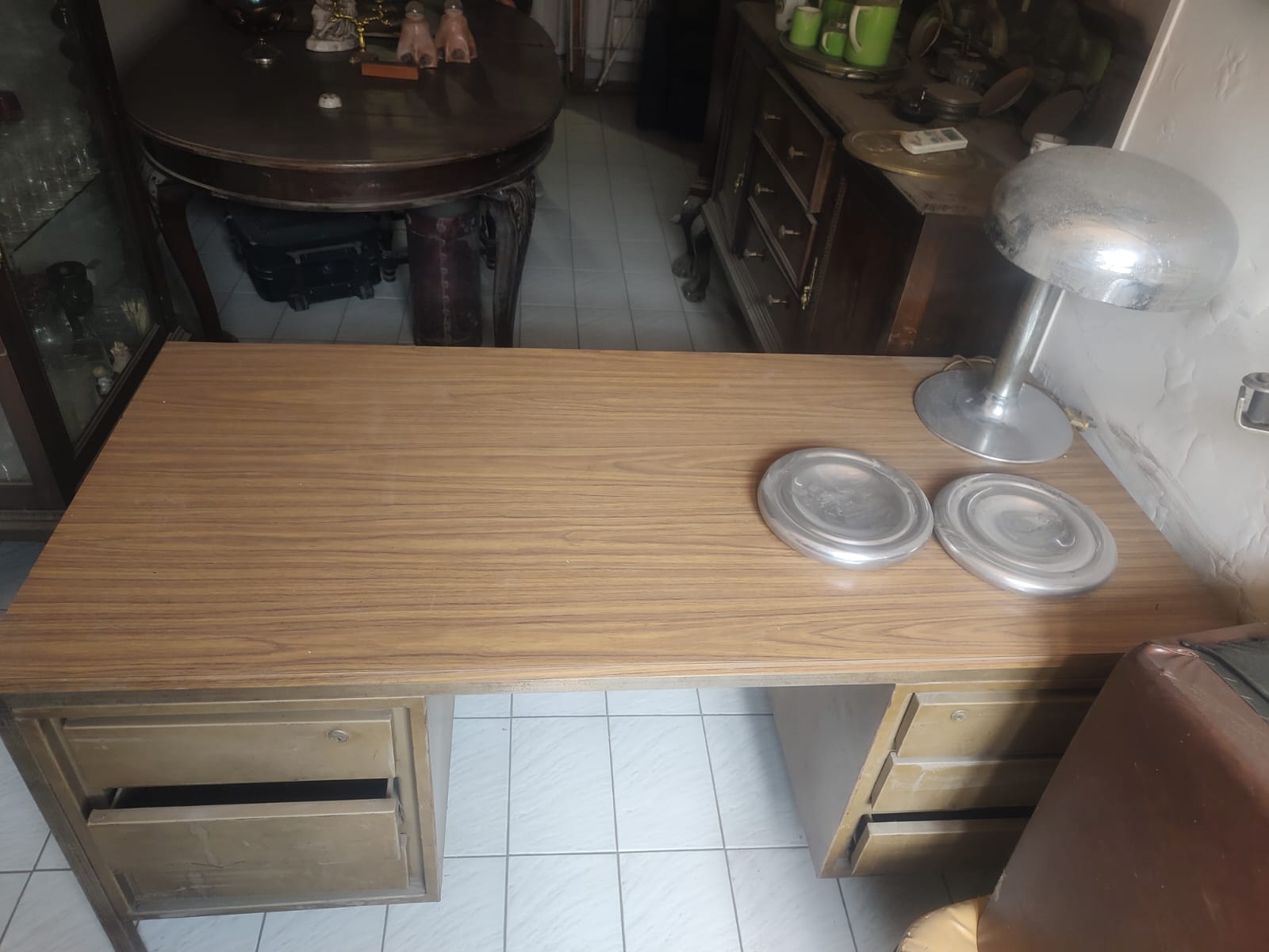Un escritorio de chapa y formica de aproximadamente 1,20 mts. X 0,50. Cuenta con juego de 3 sillas de cuerina y con ruedas.