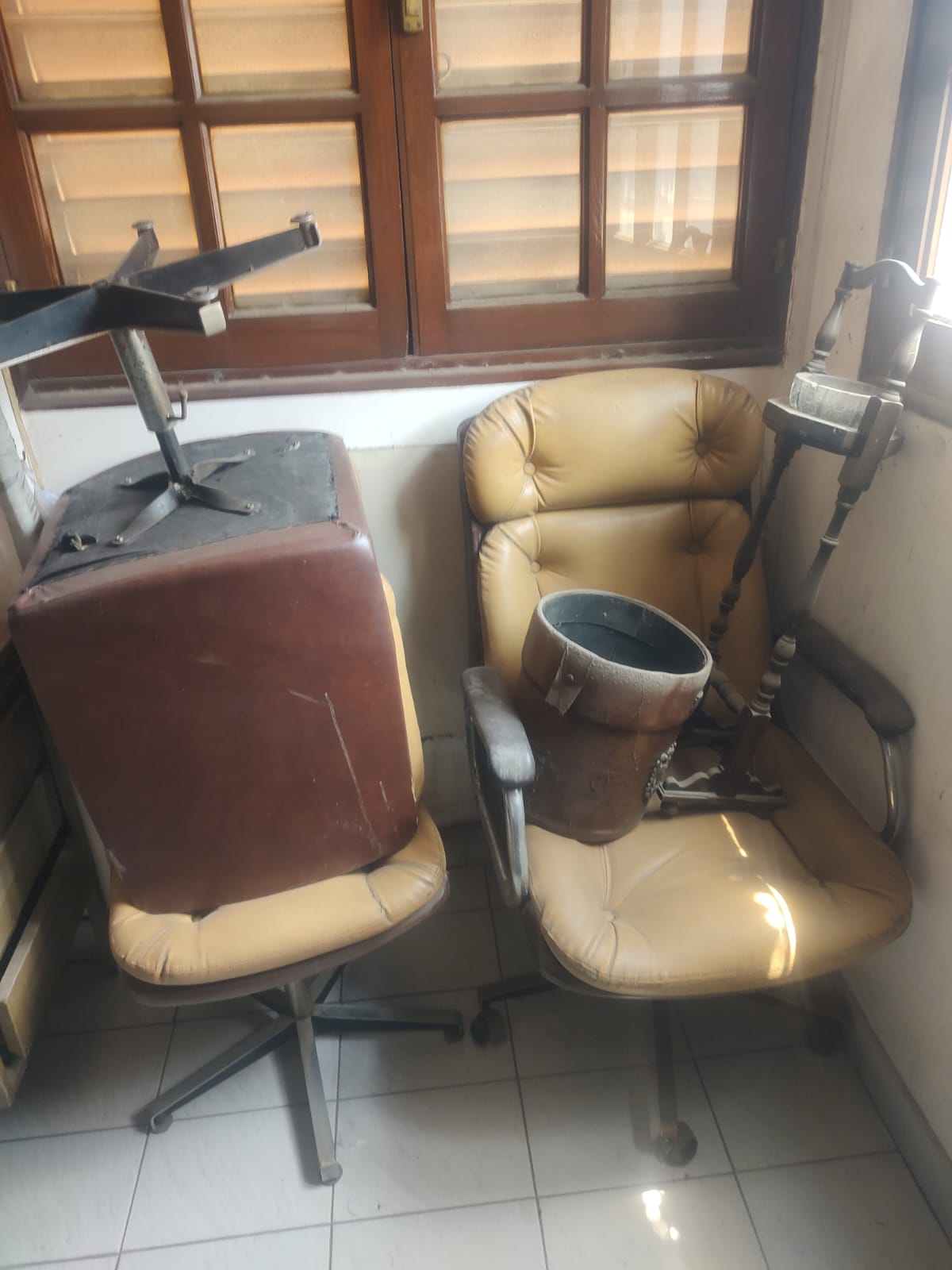 Lote 18: Un escritorio de chapa y formica de aproximadamente 1,20 mts.X 0,50. Cuenta con juego de 3 sillas de cuerina y con ruedas Precio de reserva $10.000;