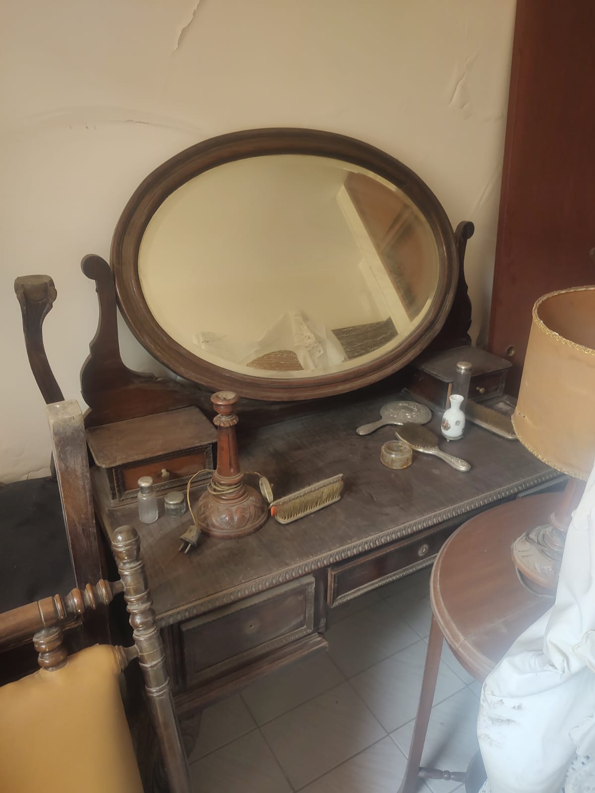 * Escritorio de madera, con cajones a ambos lados y espejo oval con marco de madera.