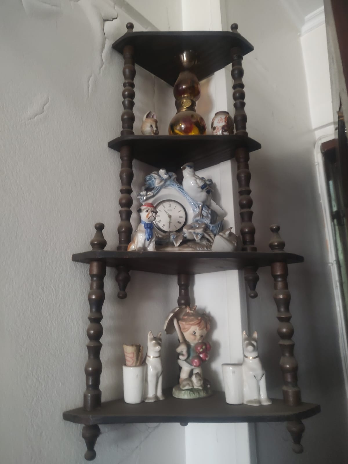 Lote 19: 2 muebles de piso uno de 0,20 x 0,20 x 0,50 y otro de 0,30 x 0,20 x 0,65. Ambos poseen estantes para libros * Repisa esquinera de madera con adornos * Mueble y cajonera con espejo de pie oval de madera. * Escritorio estilo secreter con biblioteca. Precio de reserva $10.000;