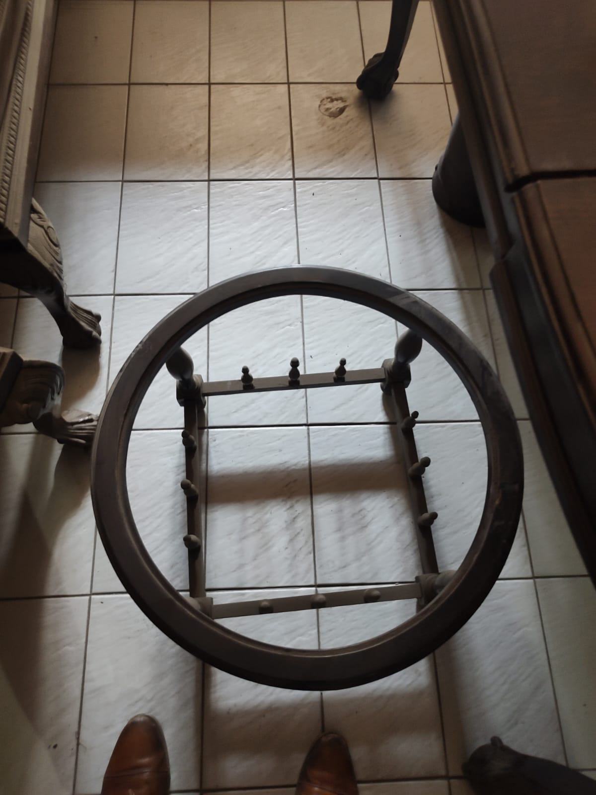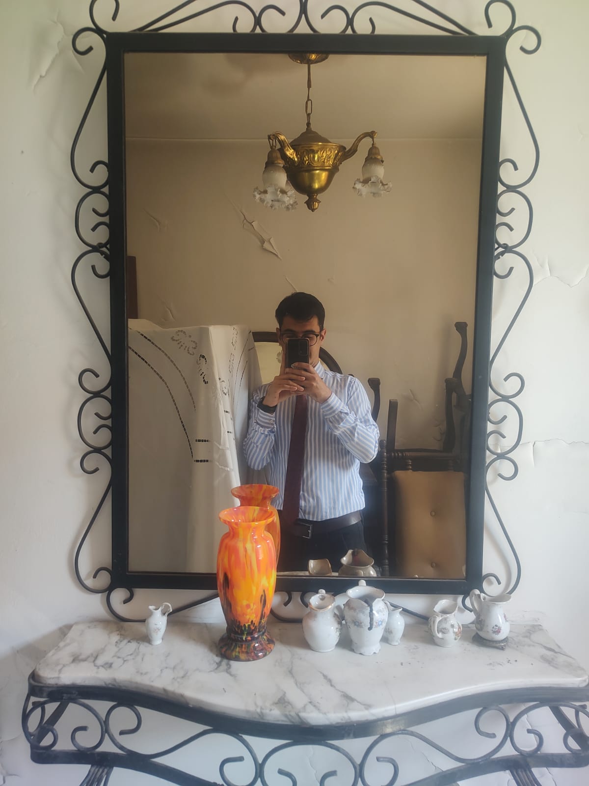 Lote 20: Espejo con estante de hierro y base de mármol *Escritorio de madera, con cajones a ambos lados y espejo oval con marco de madera. Precio de reserva$10.000;