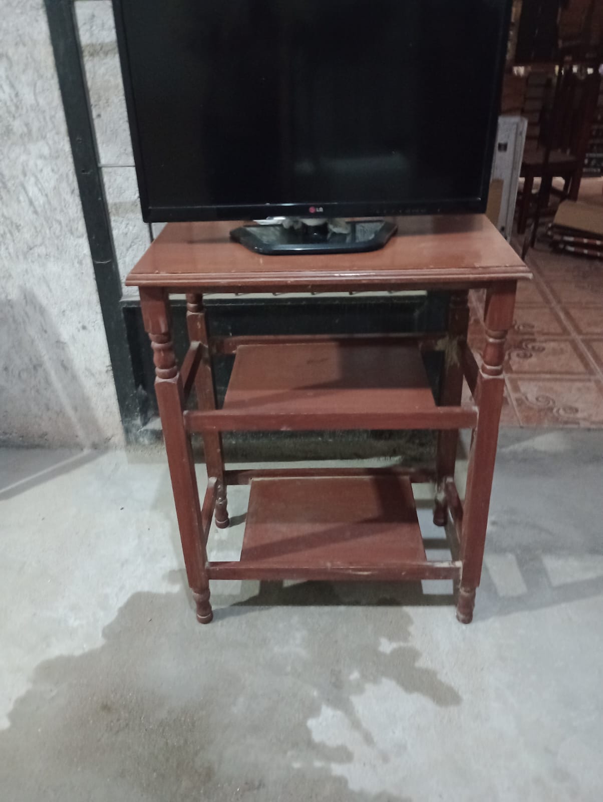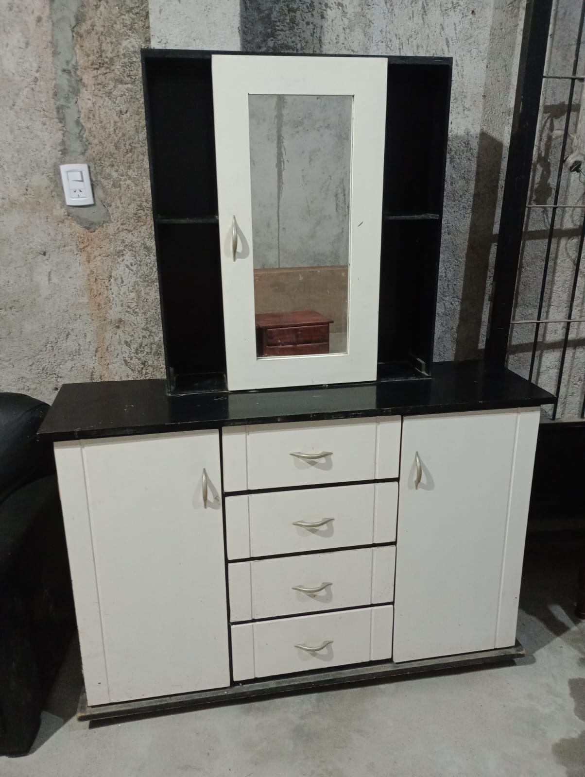 Juego de living de 2 cuerpos, 2 sillones de cuerina color negro con mesa ratona, 1 TV LG de 32 pulgadas color negro (sin control remoto), 2 mesas de lus color caoba de madera, 2 mesas de luz de melamina color blanca, 1 mesa de TV de madera, 1 chifonier con espero marrón de melamina, 1 chifonier con espejo color blanco de melamina, 1 espejo de pared con marco de madera.
