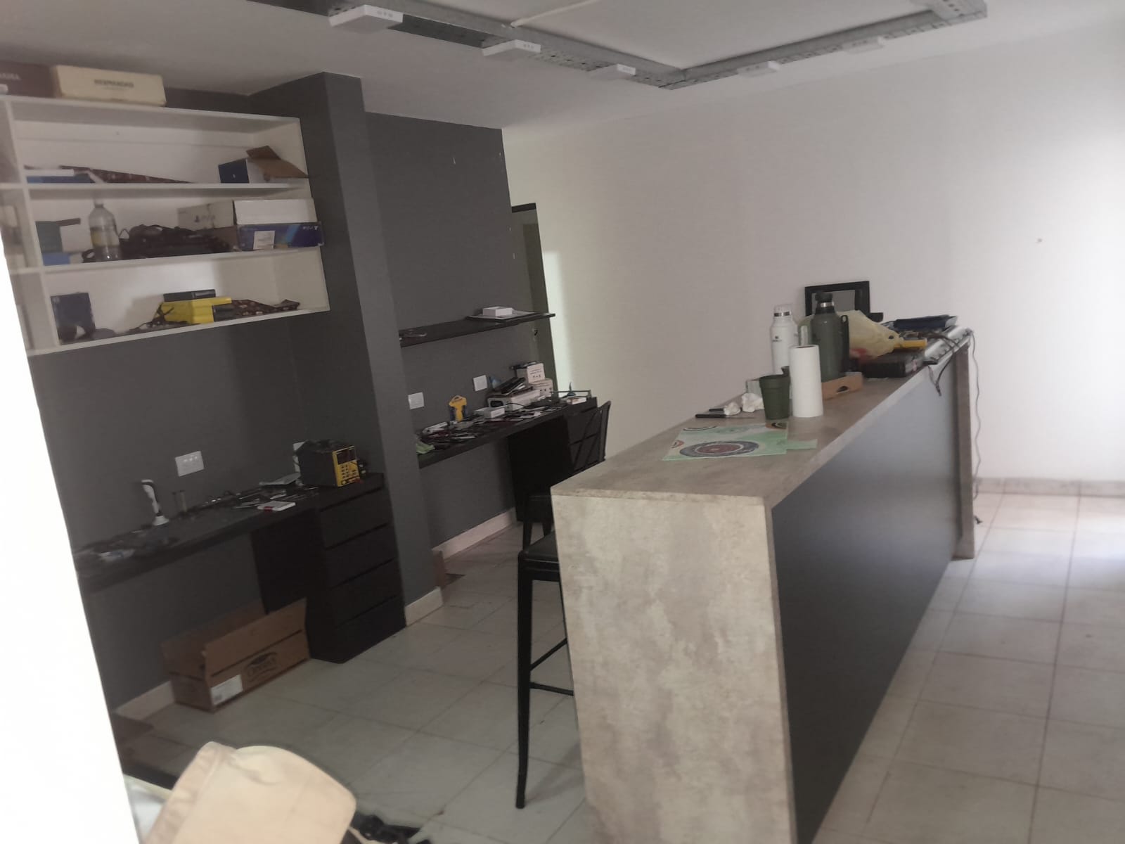 acceso de puerta de vidrio y puerta de rejas, una oficina pequeña con cerramientos de aluminio, y un ambiente con barra desayunadora, baño con hinodoro y pileta lavamanos. Asimismo, la
